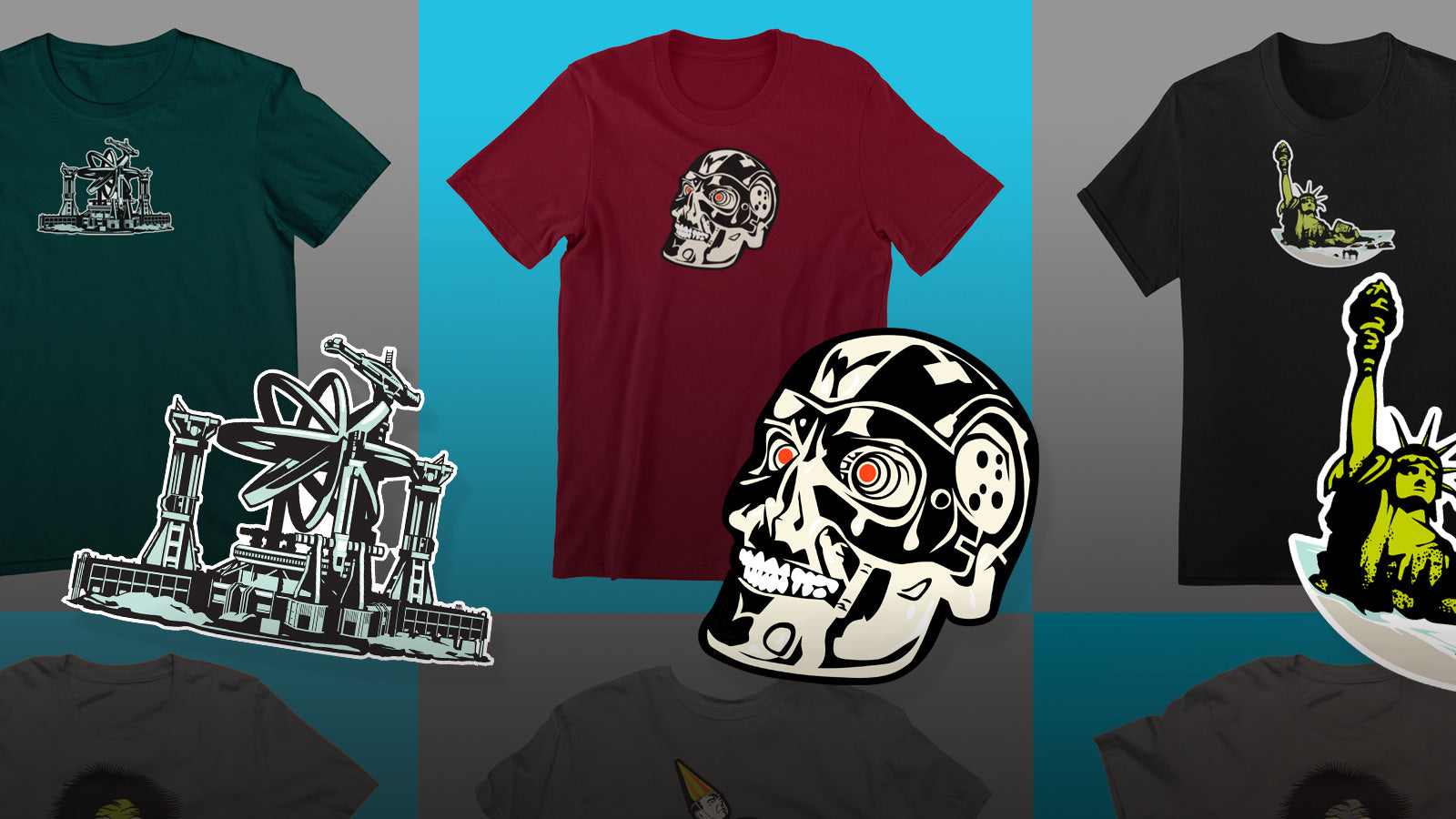 In 2014 we funded our first Kickstarter to create a highly detailed, illustrated sci-fi and fantasy map of the United States. More than a decade later, we’ve pulled eight of the best-selling scenes from that series and turned them into t-shirts — inspired by the most iconic moments on the map.