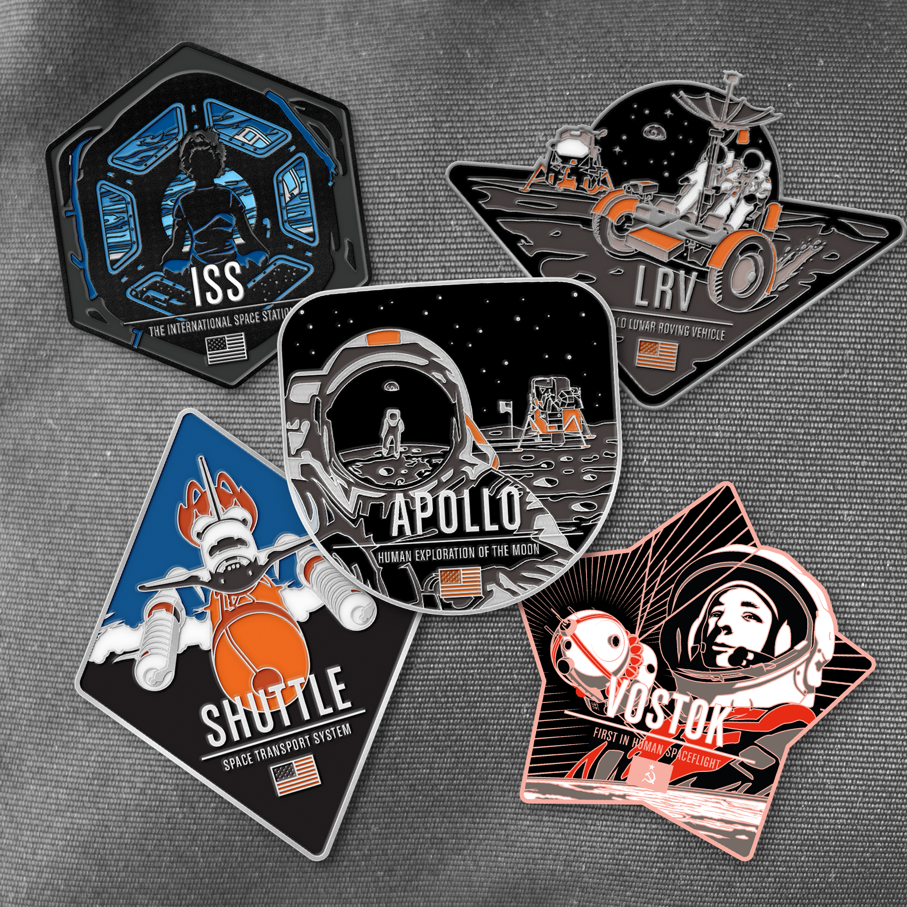 Five hard enamel pins honoring the most historic crewed space missions: Apollo 11, the International Space Station, Vostok 1, the Apollo Lunar Roving Vehicle, and the Space Shuttle. These designs celebrate the moments when humans left Earth and expanded what was possible. Also available are two vehicle-only pins — Vostok and the Apollo LEM — for those who appreciate the hardware that made those giant leaps happen.