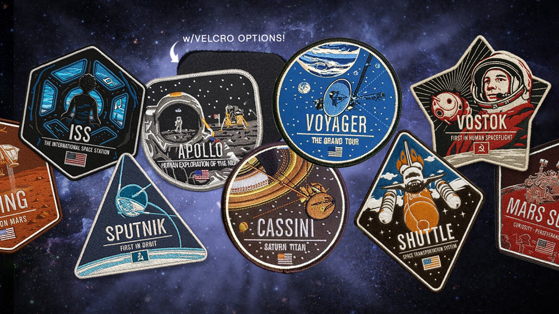 Our popular space missions, both crewed and robotic, are now available as 3.7" patches. Ten new designs from Apollo to Voyager. Each with options for iron-on or velcro backing.