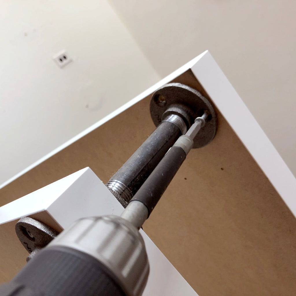 Attaching the flanges to the bottom of Linnmon is fairly straightforward. Pre-drill the tops and using short wood screws, drill them in with the drill set to very low torque. Then thread the pipe and flange for the next top.